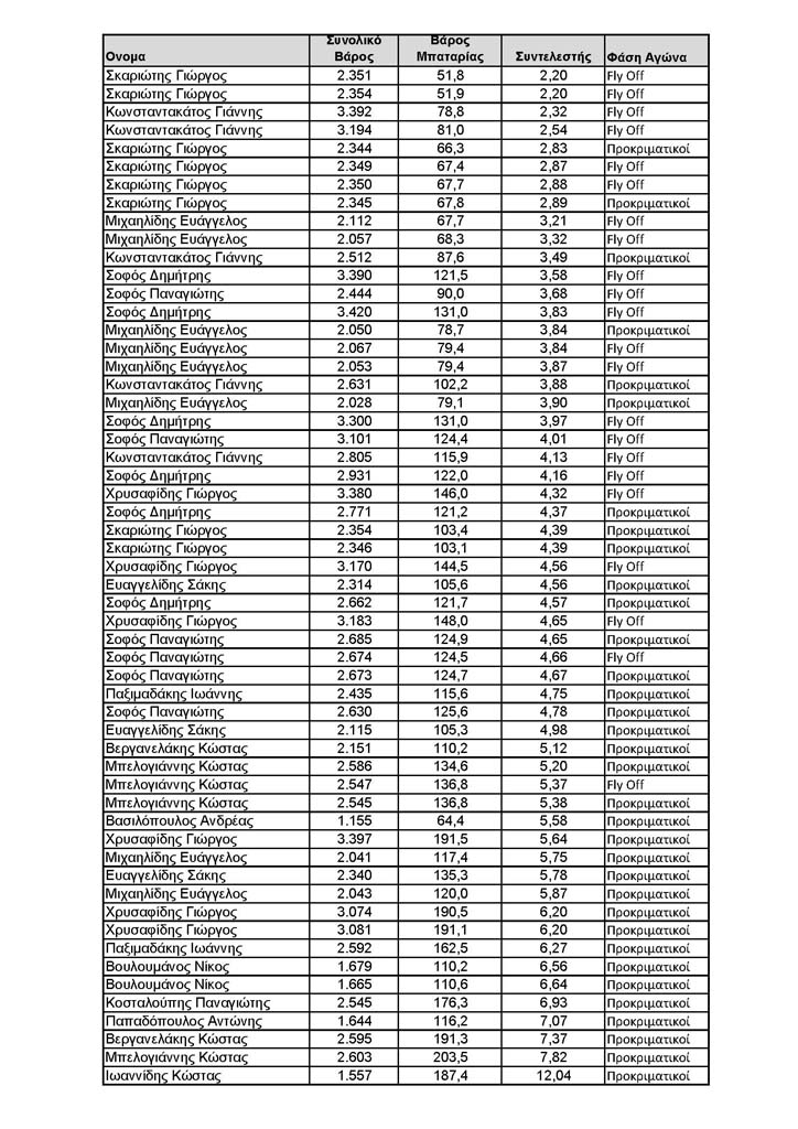 Ο πρώτος πίνακας έχει όλους τους συντελεστές με τα βάρη (μοντέλου και μπαταρίας) και την φάση του αγώνα.