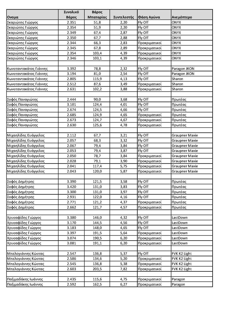Ευχαρίστως όποιος θέλει να δώσει περισσότερα στοιχεία όπως μοτέρ, έλικα, μπαταρία, κατανάλωση να τα συμπληρώσω ώστε να υπαρχει καλύτερη αποτύπωση του αγώνα, για μελλοντική χρήση από όλους τους ενδιαφερόμενους.
