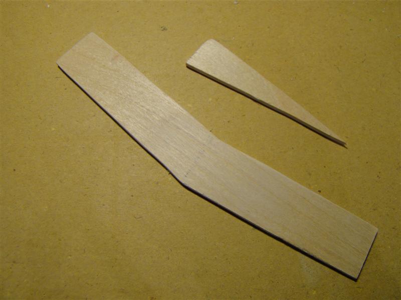 Κατασκευάζουμε από κόντρα πλακέ το joiner του φτερού με τη δίεδρο στις 13 μοίρες. Από το κόψιμο περίσσεψε και ένα μικρό τριγωνικό κομμάτι που είναι ότι πρέπει για την πίσω βακτηρία.