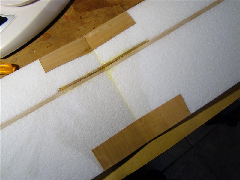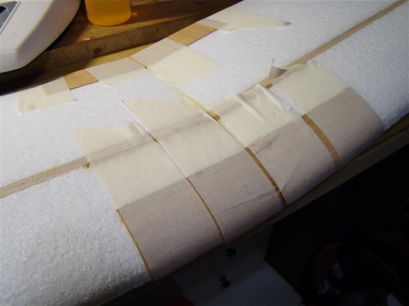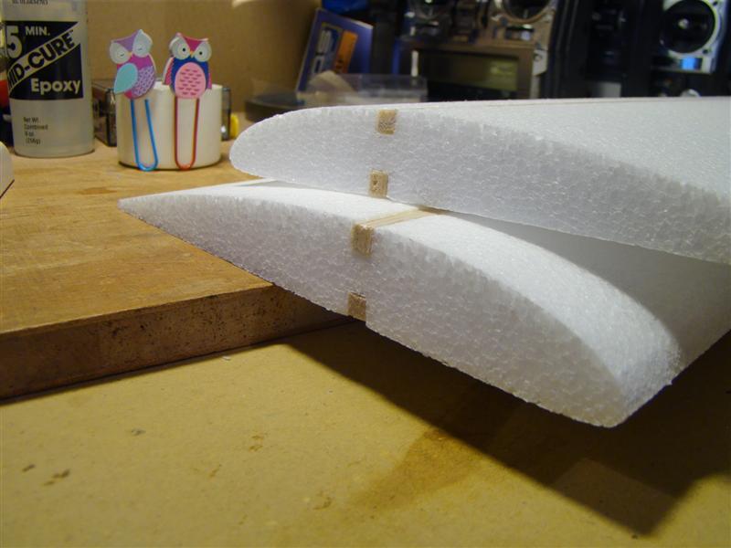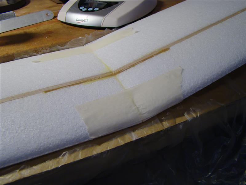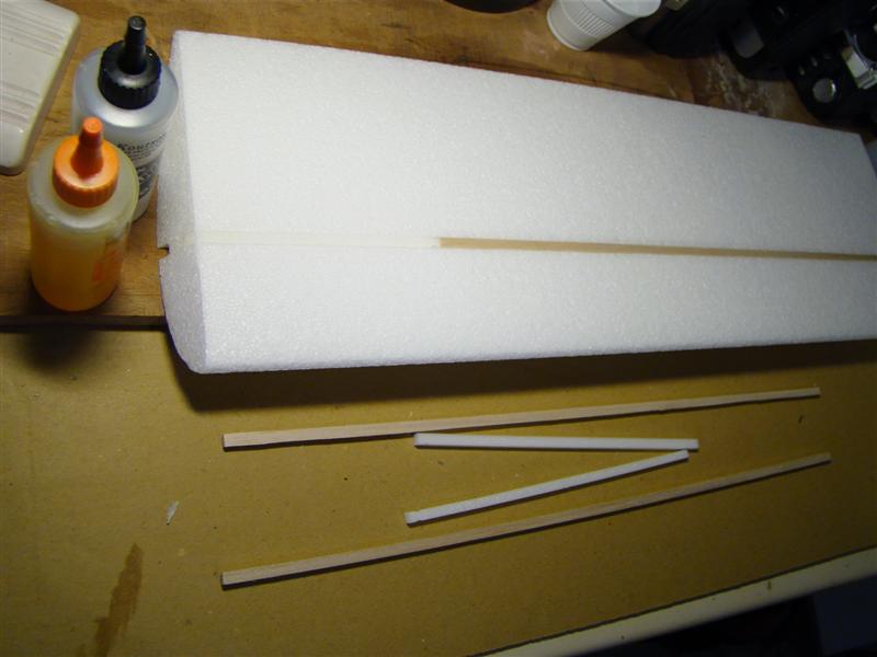 Στη συνέχεια κολλάμε με epoxy 15 λεπτών τα ξύλινα πηχάκια στις εγκοπές των φτερών ξεκινώντας από τη ρίζα του φτερού. Στο μήκος που περισσεύει μέχρι το ακροπτερύγιο κολλάμε τα μικρότερα πηχάκια από φελιζόλ.