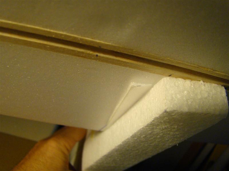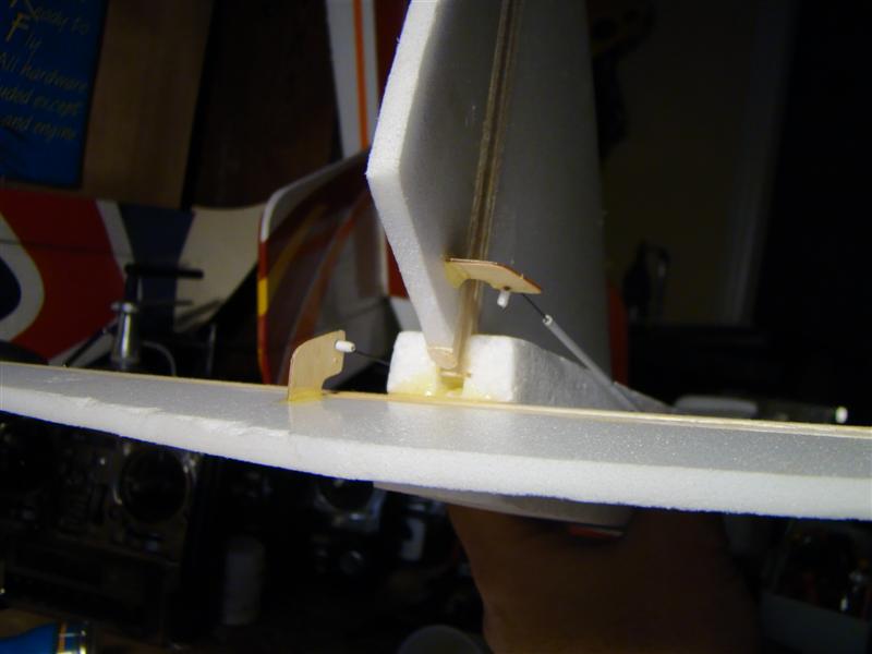 Χαράζουμε τις υποδοχές στο depron και φροντίζουμε το εμπρός μέρος των horn να ακουμπάει στο ξύλινο πηχάκι των πηδαλίων. Κολλάμε.