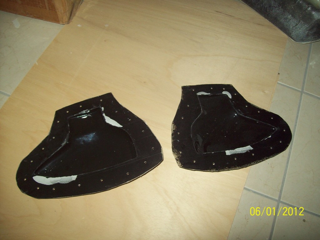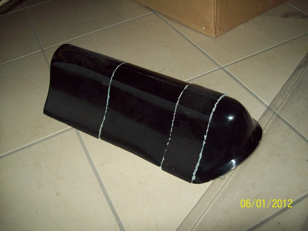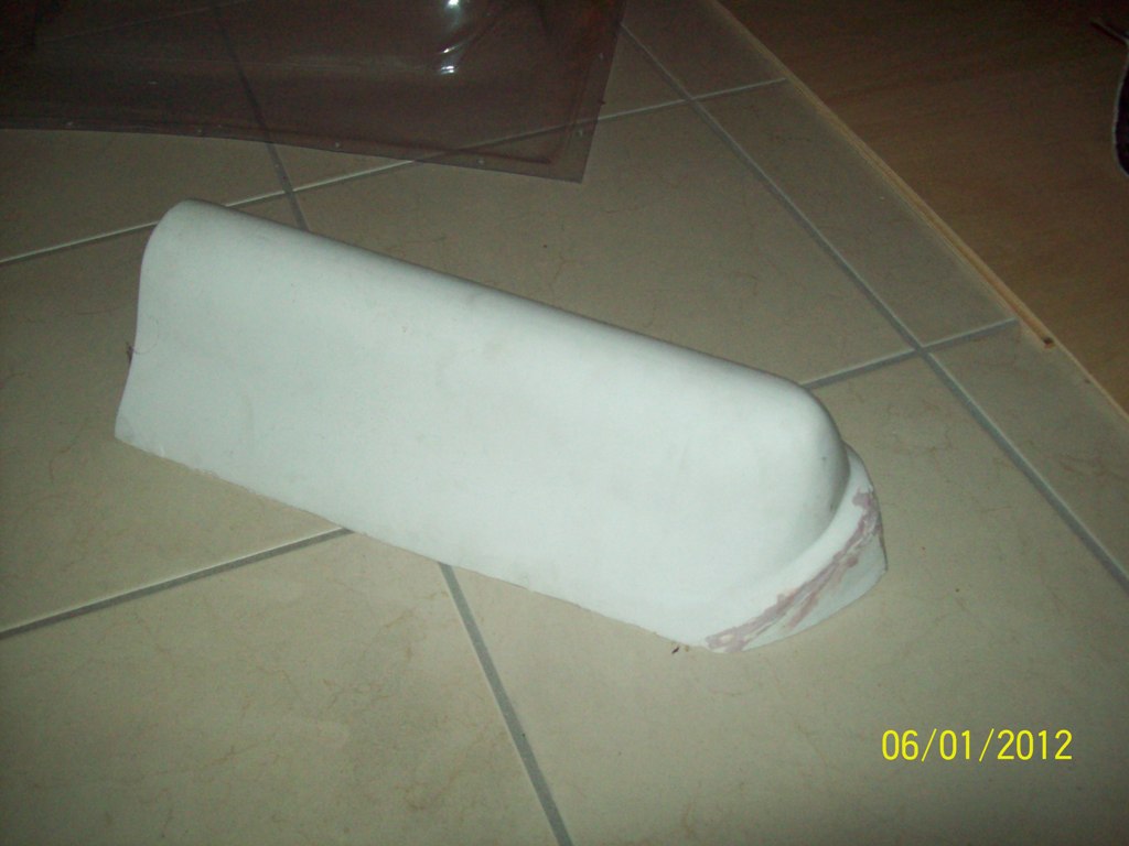 Εδώ βλέπετε το εκμαγείο από εξηλασμένη πολυστερίνη ρητινωμένο και βαμένο. Τα κοψίματα έγιναν αργότερα για να χρησιμεύσουν σαν πατρόν για τα ανοιγόμενα και σταθερά τμήματα της καλύπτρας