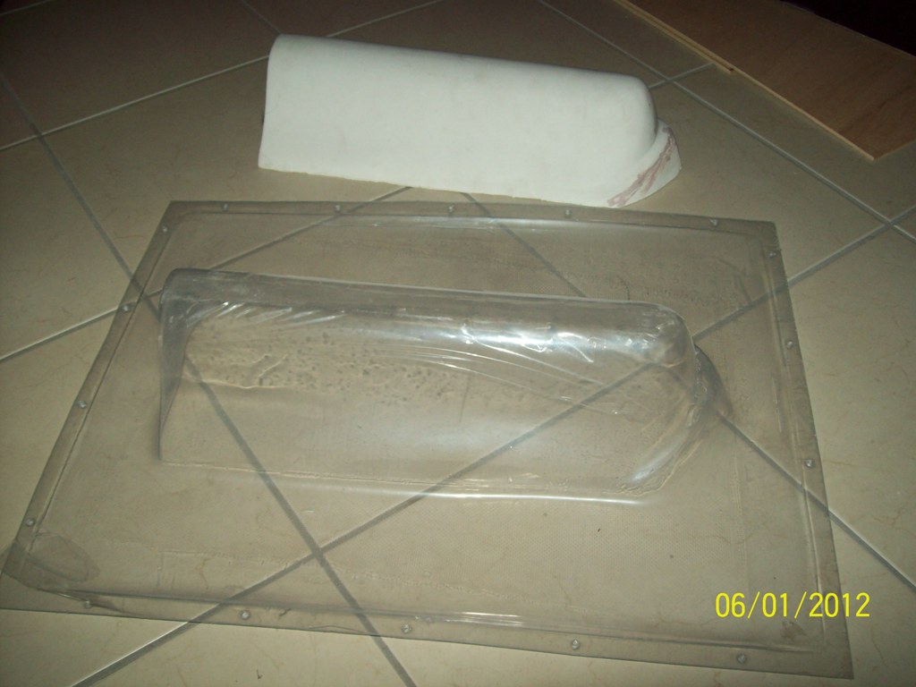 Σειρά είχε το καλούπι της καλύπτρας. Αυτό είχε ακόμη περισσότερη φασαρία. Έφταξα εκμαγείο με την ίδια τεχνική από εξηλασμένη πολυστερίνη (τριφτό). Το ρητίνωσα, έτριψα, στοκάρισα .....και τελικά έβαψα. Από το εκμαγείο αυτό προέκυψε το αρνητικό καλούπι. Αυτό το καλούπι γεμίστηκε με gyloform (ένα είδος γύψου καλουπιών) και από αυτό το θετικό καλούπι έβγαλα την καλύπτρα από PVC στο vacuume.