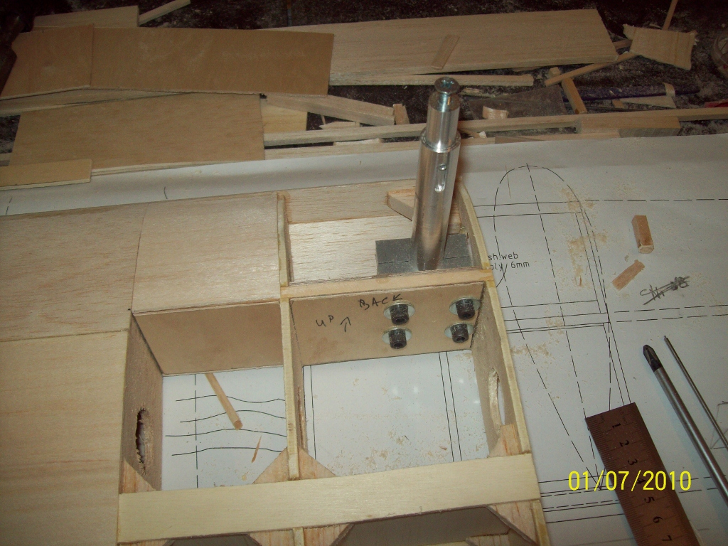 Το κόντρα πλακέ με την τρύπα που βλέπετε στη δεύτερη φωτο, είναι η βάση στην οποία βιδώνει (με βίδα από teflon για λόγους βάρους) το stabilazer το οποίο έτσι γίνεται αφαιρούμενο μαζί με το rudder αλλα και ρυθμίζεται η γωνία προσβολής του. Το τελευταίο ήταν πολύ χρήσιμο, καθώς χρειάστηκε μια επέμβαση στη γωνία προσβολής του stabilizer της τάξης του 0,75 της μοίρας μετά την πρώτη πτήση, ώστε να μην χρειάζεται ατελείωτο trim.