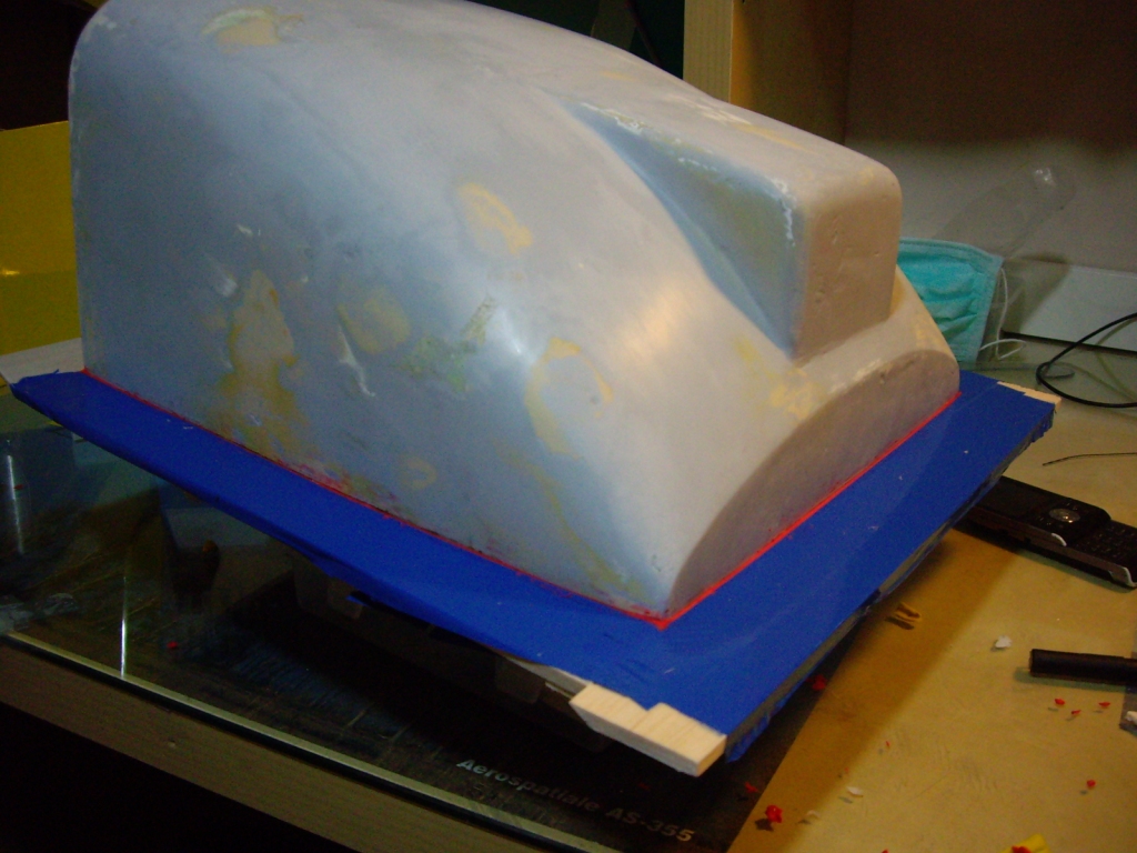 Η μία πλευρά της διαχωριστικής επιφάνειας εφάπτεται με την γραμμή που είχα σχεδιάσει.Την πλευρά αυτήν έντυσα αργότερα με περισσεόμενο monokote (για να μην έχω πρόβλημα με τους πόρους της μπαλσας) και αφού εφάρμοσα καλά την διαχωριστική επιφάνεια παρέμβαλα μεταξύ αυτής και του plug πλαστελίνη για να σιγουρευτώ ότι δεν θα έχω διαρροές στην άλλη πλευρά του plug.Πέρασα λοιπον το plug και την διαχωριστική επιφάνεια με αποκολλητικό 3-4 χέρια με αναμονή κάθε φορά να στεγνώσει το προϊγούμενο του.