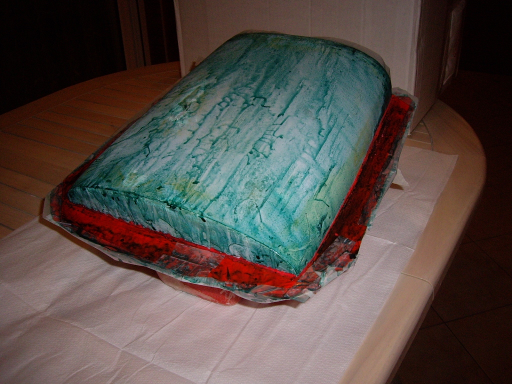 Όταν πολυμερίστηκε τόσο ώστε να μην κολλάει στα χέρια, με ένα ψαλίδι έκοψα το περίγραμμα και το άφησα στην ησυχία του να τελειώσει ο πολυμερισμός.Στην φωτό φαίνεται το πανί στρωμένο και κομμένο περιμετρικά.