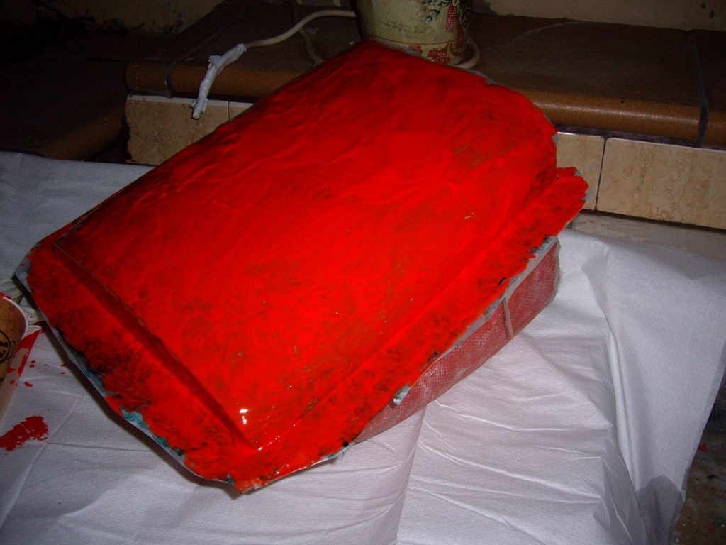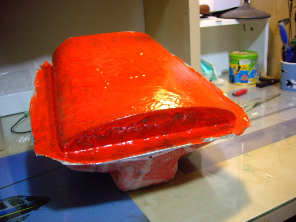 Έτσι αφού στέγνωσε το αποκολλητικό πέρασα πορτοκαλί jelcoat καλουπιών. Έτσι το ζητάνε. Μου το πρότειναν στην Neotex για να δημιουργήσω υπόστρωμα και να αντιγραφούν εύκολα οι καμπύλες και οι ακμές του plug.To gelcoat ειναι πολυεστερικό και έχει την ίδια απαίσια και βαριά μυρωδιά με τον πολυεστέρα και χρησιμοποιούμε τον ίδιο καταλύτη σε αναλογία 3-5γρ στα 100 (?)   (περίπου).