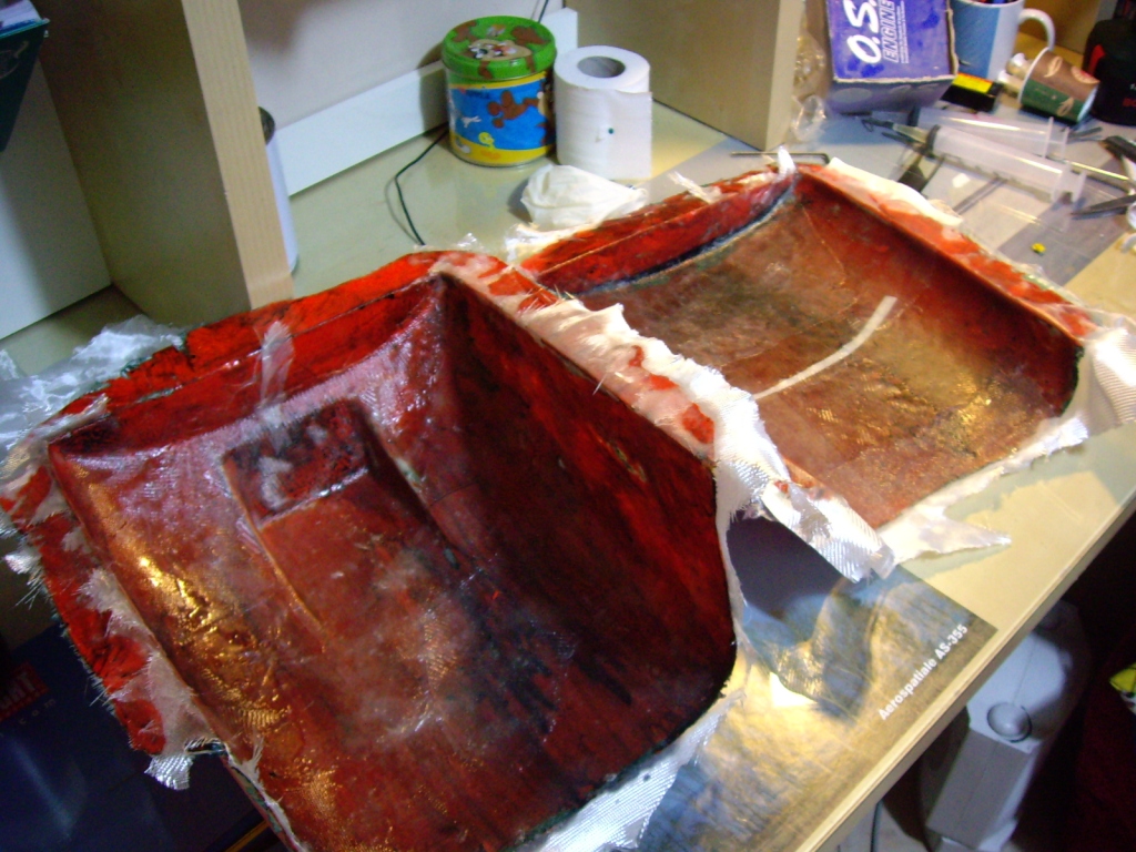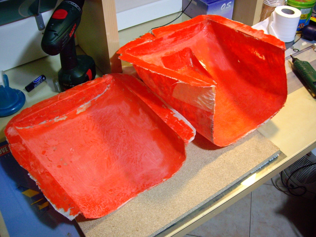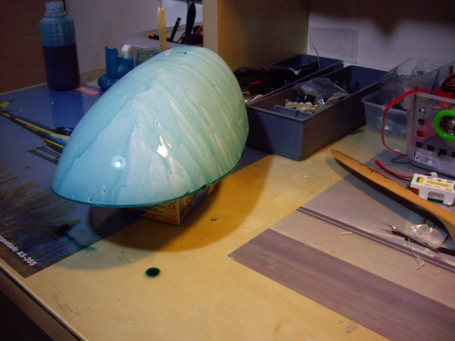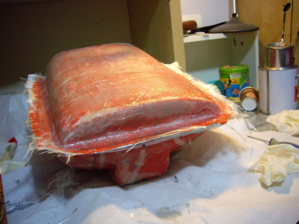 Αφού στέγνωσε το αποκολλητικό ΚΑΛΑ πέρασα με πινελάκι ένα λεπτό στρώμα πολυεστέρα και όταν τζέλαρε λίγο άπλωσα κι άλλο πολυεστέρα και έστρωσα καλά -προσέχοντας μην εγκλοβίσω αέρα- δύο φύλλα από γυαλλόπανο 163 γρ/τμ. Πρώτα το ένα, μετά το άλλο ,με ενδιάμεση επίστρωση πολυεστέρα.Χρησιμοποίησα πολυεστέρα (και όχι εποξική) για να τελειώσω πιο γρήγορα.