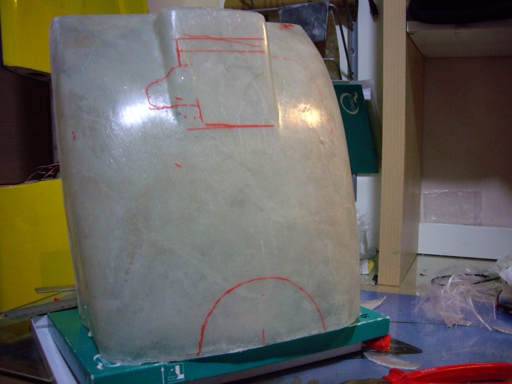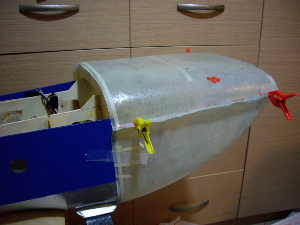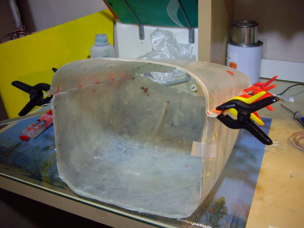 Αργότερα με πανί 290 γρ/τμ και εποξική ρητίνη κόλλησα εσωτερικά τα δύο κομμάτια μεταξύ τους και απομάκρυνα τα περισσεύματα απο fiberglass από τα πλάγια του cowl.