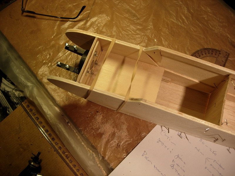 Στερεώνουμε το firewall και το οριζόντιο κόντρα πλακέ. Σφίγγουμε με λάστιχα την άτρακτο για να κρατιούνται στη θέση τους.