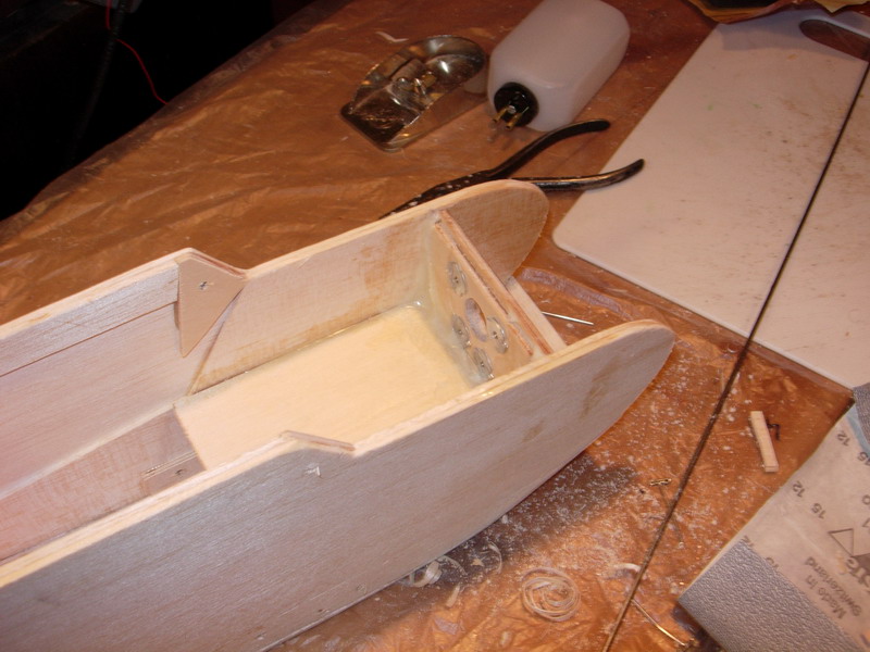 Κολλάμε το πλαίσιο της βάσης στην άτρακτο. Χρησιμοποιούμε CA για να το στερεώσουμε στη θέση που θέλουμε και ολοκληρώνουμε την κόλληση με ρητίνη από την κάτω πλευρά. Χρησιμοποιούμε και ξυλαράκια για να ενισχύσουμε την κόλληση.  (δεν φαίνονται  - είναι από κάτω)