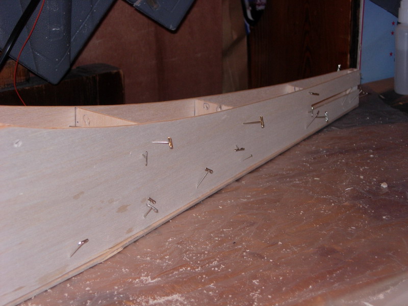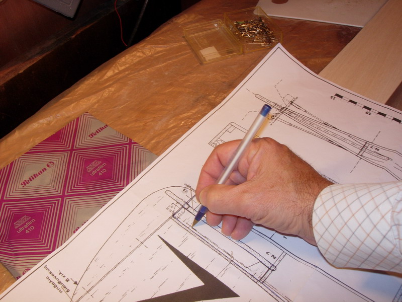 Στερεώνουμε με καρφίτσες τα κομμάτια της ατράκτου από το νομέα 3 μέχρι πίσω. (Το κάτω μέρος είναι επίπεδο από τον νομέα 3 και πίσω.) Μπορούμε να ελέγξουμε την καθετότητα των πλευρών με ένα ορθογώνιο τρίγωνο.