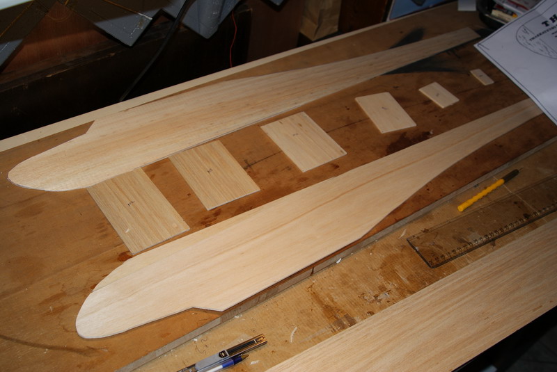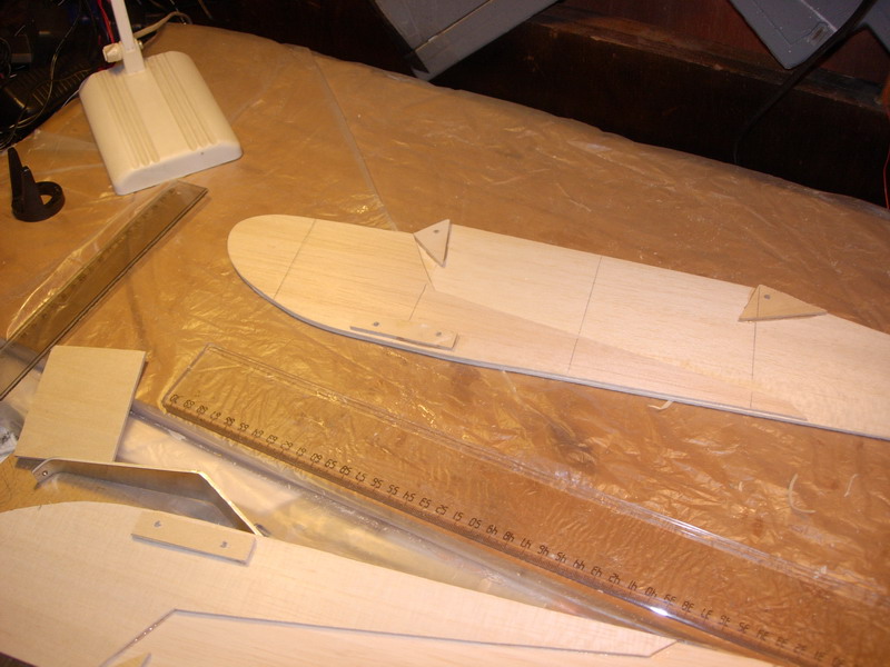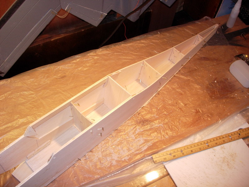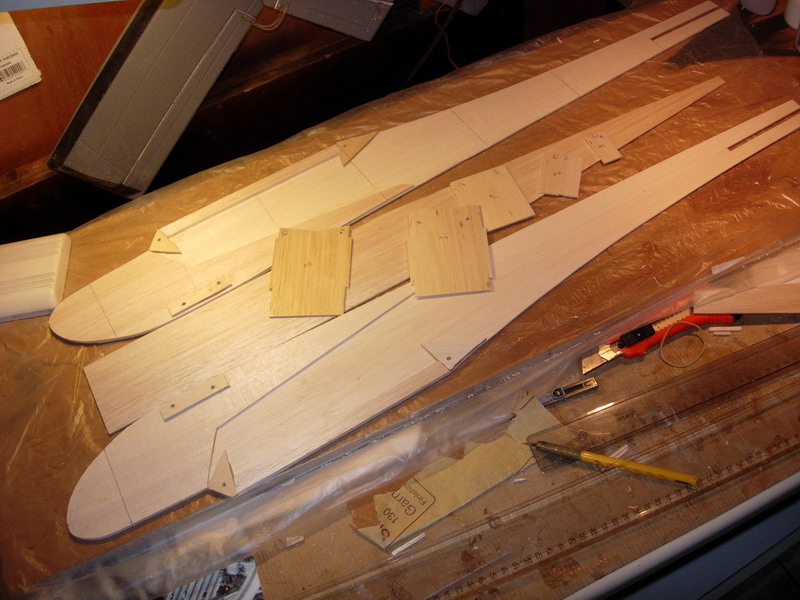 Τα κομμάτια της ατράκτου έτοιμα για συναρμολόγηση. Έχουμε ενισχύσει την άνω πλευρά της ατράκτου, όπου θα πατήσει το φτερό, με μία λωρίδα σκληρή μπάλσα 2.5mm.