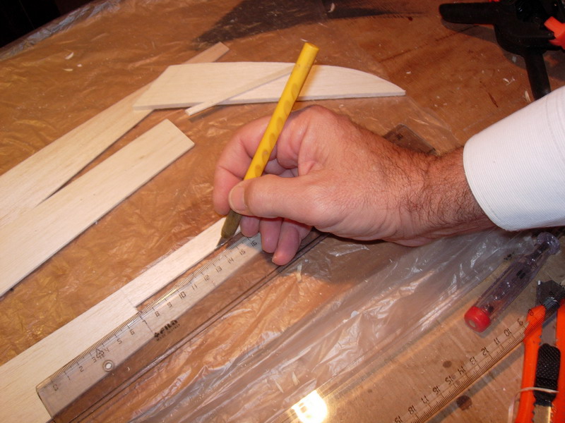 Επόμενο βήμα είναι η προετοιμασία του εργαστηρίου. Χρησιμοποιούμε πλακάζ πάχους 16mm πάνω στο οποίο θα χτίσουμε την άτρακτο και το φτερό. Οι διαστάσεις του δικού μου είναι 200cm x 40cm. Για να μη κολλάνε τα ξύλα μας στον πλακάζ περνάμε μια σακκούλα αποθήκευσης χαλιών από πάνω. Έτσι προστατεύουμε και το σχέδιο.