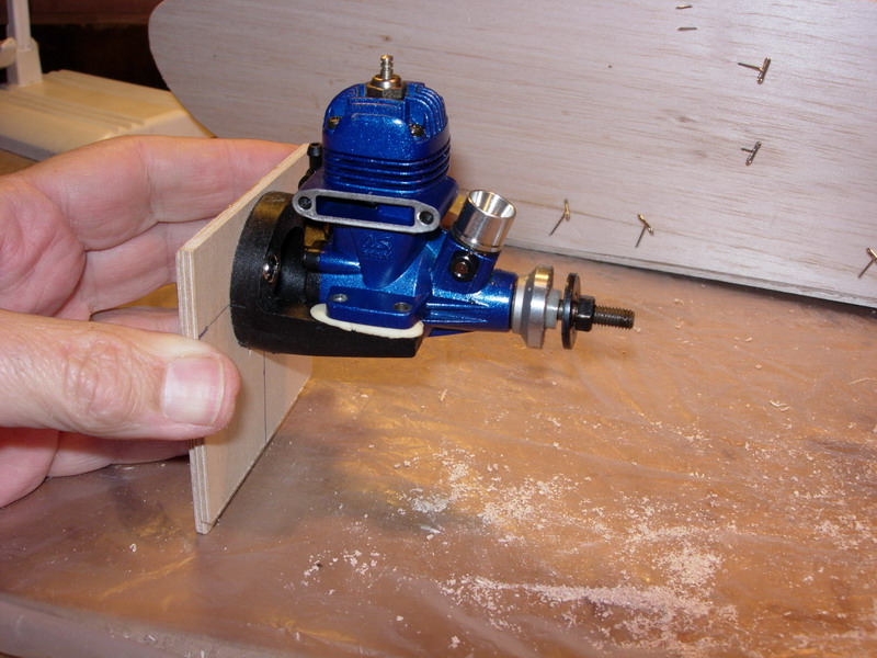 Κόβουμε το firewall από κοντρα πλακέ 3mm καλής ποιότητας. Θα χρησιμοποιήσουμε βίδες Μ3 και blind nuts. Επειδή τα blind nuts έχουν μεγαλύτερο μήκος από 3mm, χρησιμοποιούμε διπλό κοντρα πλακέ. Σημαδεύουμε τη θέση της βάσης στο firewall. Υπάρχουν τέσσερεις γραμμές ανάγλυφες πάνω στη βάση (άνω, κάτω, δεξιά και αριστερά) που βοηθούν στην συμμετρική τοποθέτηση. Επειδή με τη γωνία righthrust που θα δώσουμε στο firewall ο άξονας της έλικας θα μετακινηθεί προς τα δεξιά κατά 3mm, μετακινούμε τη βάση της μηχανής κατά 3mm πιο αριστερά από το κέντρο. Έτσι ο άξονας της έλικας θα ταυτισθεί με τον διαμήκη άξονα της ατράκτου