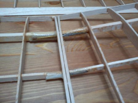 Η ένωση στο ένα αποσπώμενο ακροπτερύγιο, μετά και την τοποθέτηση των έξτρα νομέων και την ασφάλιση σωληνών και συρμάτων με έποξυ και υαλούφασμα. Συνολικό βάρος φτερού με αυτόν τον τρόπο (δηλ. τα αποσπώμενα ακροπτερύγια) στα 212gr, πριν την επικάλυψη.