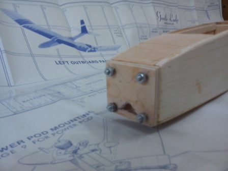 Η μύτη θα δεχτεί ένα brushless outrunner των 150watt περίπου, κινούμενο από μια 3S μπαταρία των 1500mAh. Τα "μποζόνια" είναι στην πραγματικότητα βιδάκια σφηνομένα ανάμεσα στο firewall και τον πρώτο νομέα.